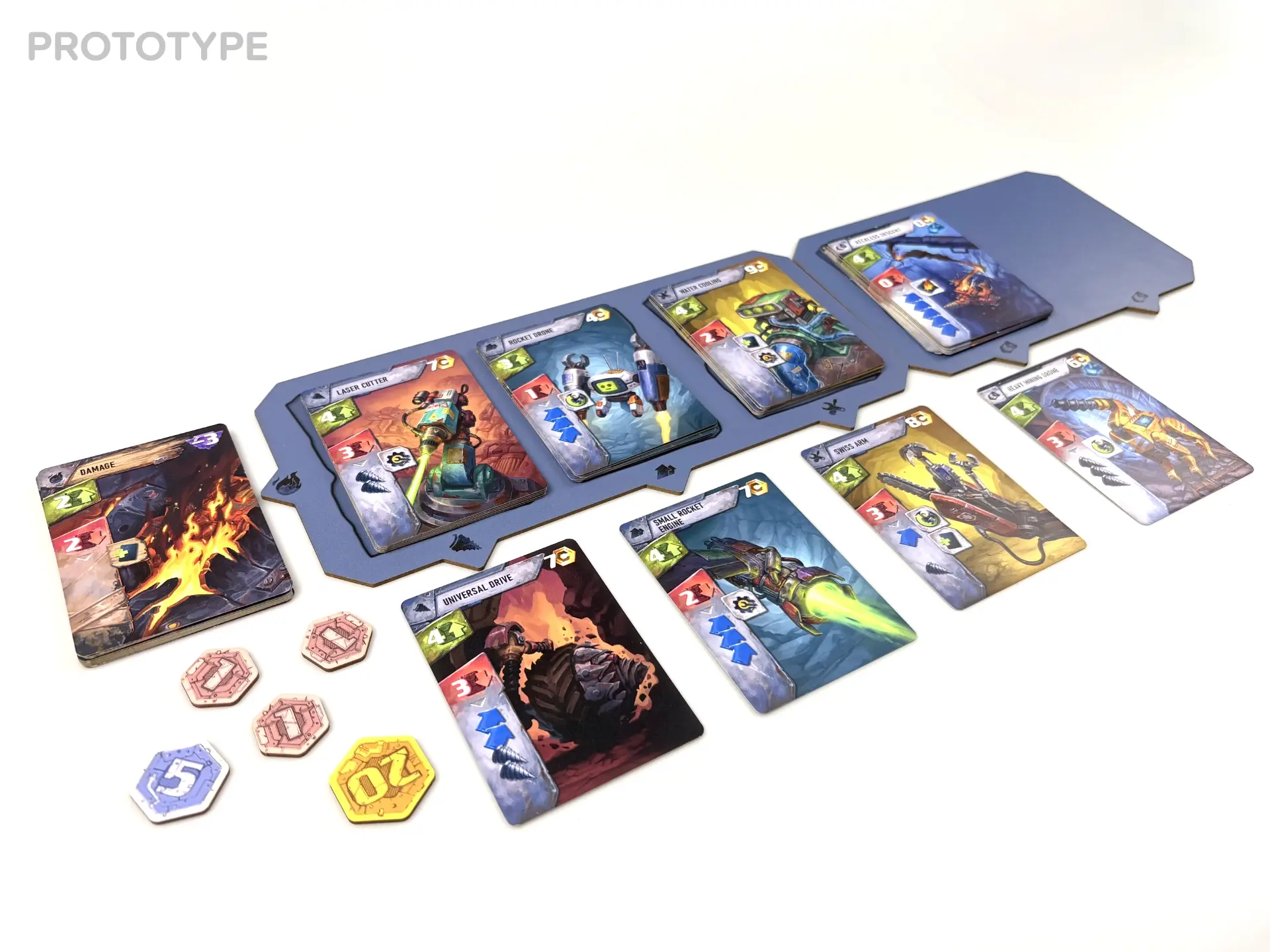 Each level of the mine brings new opportunities and new challenges as fuel runs low and decisions become tighter. By collecting cards, players unlock new actions and improve the drilling capabilities of their mechs—inspired by iconic real-life vehicles—to push their operations deeper underground. Sell your collected minerals and upgrade your machine once you make it back to the surface, or use drones to automate the logistics.